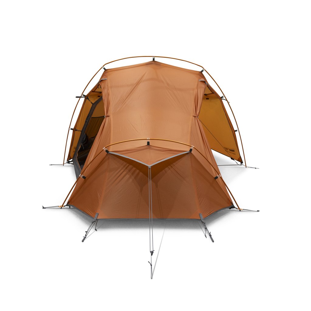 - Double porch on each side of the tent provides sheltered space to store gear